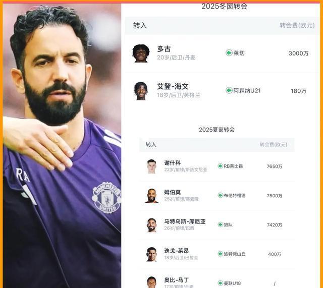 但是在现有的这一帮球员里,我们并没有看到他们的战斗力在哪里。要说高层对阿莫林的支持力度其实也是相当之大的,葡萄牙少帅自去年11月正式上任后,曼联便在今年一月份的转会窗口引进了两名小将多古和海文以补充吃紧的后防线厚度,而在这两月里也先后签入了姆伯莫、库尼亚、谢什科等球员,累计花费?花费接近2亿英镑。